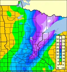 | Maximum snowfall or ice accretion | 37 inches (94 cm) (Duluth, MN) |