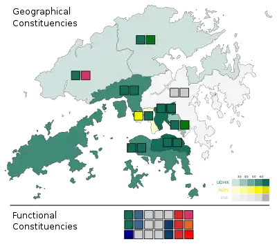 | United Democrats of Hong Kong | 618,209 | 45.15 | 14 | 12 | 15,208 | 66.46 | 3 | 2 | 14 | ||