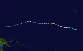 The system continued intensifying until reaching hurricane status at 0000 UTC on January 30, and it reached major hurricane status on February 2, reaching maximum sustained winds of 115 mph (185 km/h).[5] However, unfavorable wind shear began taking a toll on the storm, causing it to rapidly weaken. Ekeka crossed the International Date Line as a weakened tropical storm, and shortly thereafter degraded to tropical depression status. Ekeka continued westward, passing through the Marshall Islands and later over Chuuk, before dissipating on February 9 about 310 mi (500 km) off the north coast of Papua New Guinea.[2]