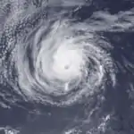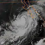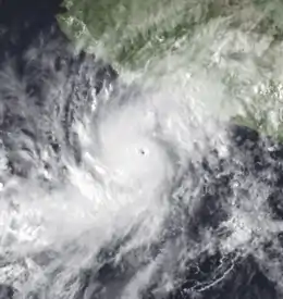 Late on July 15, Hurricane Frank passed about 175 mi (280 km) south of Socorro Island. A station on the island reported winds of 67 mph (107 km/h), which indicated that the hurricane had a large wind field.[40] Slow intensification continued, and Frank intensified into a major hurricane, or a Category 3 on the Saffir-Simpson Hurricane Scale, on July 17.[2] By that time, the eye had become well-defined,[41] and later became surrounded by a ring of deep convection. On July 18, Frank reached its peak intensity of 145 mph (230 km/h) well to the west-southwest of the Baja California peninsula.[42] By July 20, winds dropped below major hurricane intensity, and by the evening, Frank was just a Category 1 hurricane.
