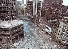 The Bishopsgate bombing occurred on 24 April 1993, when the Provisional Irish Republican Army (IRA) detonated a powerful truck bomb on Bishopsgate, a major thoroughfare in London's financial district, the City of London. Telephoned warnings were sent about an hour beforehand, but a news photographer was killed in the blast and 44 people were injured, with fatalities minimised due to it occurring on a Saturday. The blast destroyed the nearby St Ethelburga's church and wrecked Liverpool Street station and the NatWest Tower.[1][2]