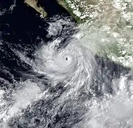 A tropical wave moved off Africa on August 14 and remained a distinct feature on its voyage across the Atlantic. The wave spawned an area of disturbed weather south of Mexico that began to show signs of organization by August 26. Three days later, at 00:00 UTC, the system developed into a tropical depression.[35] An upper-level anticyclone provided a low wind shear environment around the cyclone,[36] facilitating its quick intensification over later days. It became Tropical Storm Jova at 18:00 UTC on August 29, a hurricane around 06:00 UTC on August 31, and a major hurricane – the fifth in August alone – eighteen hours later.[18] On September 1, Jova became a Category 4 hurricane with peak winds of 130 mph (215 km/h). The system encountered increasingly cool waters as it moved northwest parallel to the Mexico coastline and began to weaken accordingly,[37] though this process was temporarily interrupted by a reappearance of its eye on September 2 and restrengthening into a Category 2 hurricane on September 3.[18][38] As the system passed about 805 mi (1,295 km) south of Baja California Sur around 00:00 UTC on September 6, it was reduced to a bare swirl of statrocumulus clouds.[35] The outer bands of Jova produced heavy rainfall in Durango, particular in its capital Durango City, prompting the evacuation of 1,500 people across 20 neighborhoods because of flooded homes.[39]