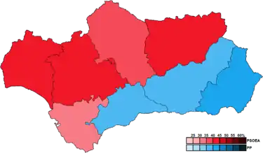 ![]() Constituency results map for the Parliament of Andalusia | ||||||||||||||||||||||||||||||||||||||||||||||||||||||||||||||||||||||||||||||||||