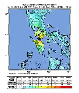 The 1994 Mindoro earthquake occurred at 03:15:30 PST on November 15 near Mindoro, Philippines. It had a moment magnitude of 7.1 and a maximum Rossi–Forel of VII (Very strong tremor). It is associated with a 35 kilometer-long ground rupture, called the Aglubang River fault.[5] Seventy eight people were reported dead,[6] and 7,566 houses were damaged. The earthquake generated a tsunami and landslides on the Verde Island.