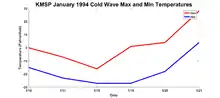 The 1994 North American cold wave occurred over the midwestern United States, eastern United States, and southern Canada during January 1994. Two notable cold air events occurred from January 18–19 and from January 21–22. There were 67 minimum temperature records set on January 19.[1] Indiana and Kentucky both set state records on January 19.[2] The United States experienced its coldest temperature month since February 1934, although much of the West experienced mild temperatures. Washington and Idaho experienced the second-warmest January recorded in the previous 100 years.[1]
