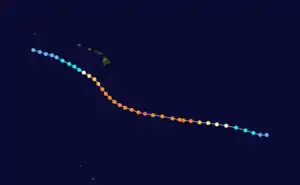 In the Central Pacific Hurricane Center's area of responsibility (140°W to the International Date Line), three depressions, two tropical storms, and one hurricane formed. Overall, there were eleven tropical cyclones, eight tropical storms, five hurricanes, and three major hurricanes that formed or entered the Central Pacific region.[3] These numbers are well above the long-term average of four tropical cyclones, two hurricanes, one tropical storm, and two depressions.[4] The exceptionally high activity was contributed to by an El Niño ongoing at the time.[5]