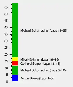 Schumacher took the lead on track on lap 12 when Berger ran wide, before relinquishing the race lead overall to Berger when he made his first pit stop, confirming that his pace both before and after the red flag was down to his running a three-stop strategy, therefore racing with a lighter car. Berger made a pit stop at the end of lap 15 for his first of two scheduled stops, before retiring a lap later with handling problems. Häkkinen led his first ever laps of a Formula One World Championship race, before he made a pit stop at the conclusion of lap 18. Following the first series of pit stops, Schumacher resumed the race lead on aggregate, overtaking Nicola Larini on track at Tosa. Schumacher's extra pace as a result of his lighter fuel loads meant he was able to pull out enough of a gap to Häkkinen which enabled him to make an extra pit stop. Häkkinen's pace was very slow, allowing Larini to leapfrog him when drivers who planned to make two pit stops made their final pit stops.[29]