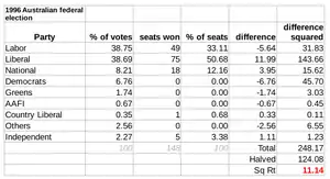 The election-eve Newspoll reported the Liberal/National Coalition held an estimated 53.5 percent two-party-preferred vote.[1]