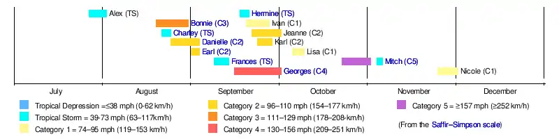 Activity in the season began slowly, with the first tropical cyclone not forming until July 27. It did not become Tropical Storm Alex until July 29, which was an abnormally late first named storm for an Atlantic hurricane season. After being dormant for about two weeks, Hurricane Bonnie developed on August 19. Thereafter, tropical cyclogenesis became more frequent, with an additional three storms by the end of August. September was the most active month, coinciding with the climatological peak of the season. Six tropical cyclones formed in that month, four of which reached hurricane intensity. Four hurricanes were active on September 26, with Georges over the Straits of Florida, Ivan in the North Atlantic, Jeanne was located near Cape Verde, and Karl was situated over the Central Atlantic. This was the first such occurrence since August 22 in 1893. However, three hurricanes also co-existed in the Atlantic on September 11 in 1961, with a possible fourth.[15] Following a busy September, activity began slowing, starting in October, when only two tropical cyclones developed. However, both storms became a hurricane, with the second cyclone, Hurricane Mitch, become the most intense, deadliest, and costliest storm of the 1998 Atlantic hurricane season.[11]