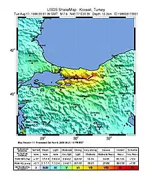 During the summer of 1999, Turkey was hit by a series of earthquakes. The mainshock of the İzmit earthquake, also known as the Kocaeli earthquake or Gölcük earthquake,[6] occurred on August 17, with its epicenter located in İzmit, with a moment magnitude of 7.6 and maximum Mercalli intensity of X (Extreme). The shaking lasted 37 seconds, causing great damage to the area and many casualties.