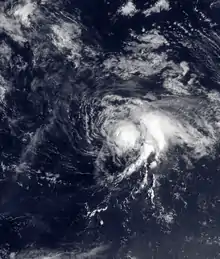 On August 18, a tropical wave moved westward off the coast of Africa. With low pressures and gradually organizing convection, Tropical Depression Four developed west of Senegal early on August 19.[34] Initially it failed to intensify due to wind shear,[34] and the center became ill-defined on August 20.[35] After passing south of Cape Verde,[36] the depression intensified into Tropical Storm Cindy as the convection became concentrated around the center.[37] Due to a strong ridge, Cindy moved westward, before turning northwestward by August 21.[38] Banding features gradually increased as outflow improved,[39] and late on August 21, Cindy became a hurricane.[40] Afterward, increased wind shear dislocated the convection from the center,[41] which weakened Cindy to a tropical storm.[42]