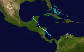 A tropical wave crossed the west coast of Africa on June 20. As the wave moved into the western Caribbean Sea on June 30, a broad cyclonic turning was noted. The system moved over the Yucatán Peninsula on July 1, a day before emerging into the Bay of Campeche as a weak low pressure area. Later on July 2, deep convection became more organized while the system was centered over the southwestern Gulf of Mexico. By 18:00 UTC, the low developed into Tropical Depression Two. Around 04:00 UTC on July 3, the depression made landfall about 40 mi (65 km) south-southeast of Tuxpan, Veracruz, with winds of 35 mph (55 km/h). Eight hours later, it dissipated over the mountains of Mexico.[12] The depression dropped heavy rain on the area amounting to a maximum of 20.37 in (517 mm) at Tanzabaca, San Luis Potosí.[24] In some areas, up to 12.49 in (317 mm) of precipitation fell in 24 hours.[12]