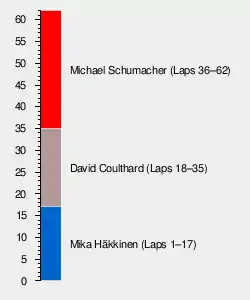 This remained unchanged until both drivers made pitstops for fuel and tyres. Schumacher stopped earlier and for a shorter time than Coulthard allowing him to take over the lead from the McLaren driver. Schumacher then gradually expanded his lead to a maximum of about 23 seconds before making a second pit stop. He was able to stay in first place and thereafter comfortably retained his position to secure his first win of the season.[2][3]