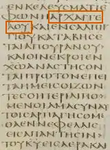 ![]() First Epistle to the Thessalonians 4:16 (with the word archangelou, "of an archangel", in the red box) on Codex Sinaiticus (c. 330–360). | |