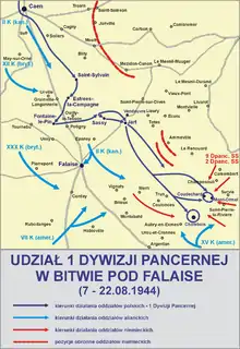 By the end of July 1944, the 1st Armoured had been transferred to Normandy, its final elements arriving on 1 August. The unit was attached to the First Canadian Army as part of the 21st Army Group. This may have been done to help in communication, as the vast majority of Poles did not speak English when they arrived in United Kingdom from 1940 onwards. The Division joined combat on 8 August during Operation Totalize. It twice suffered serious casualties as a result of "friendly fire" from Allied aircraft, but achieved a victory against the Wehrmacht in the battles for Mont Ormel,[1] and the town of Chambois. This series of offensive and defensive operations came to be known as the Battle of Falaise, in which a large number of German Army and SS divisions were trapped in the Falaise Pocket[2] and subsequently destroyed. Maczek's division had the crucial role of closing the pocket at the escape route of the trapped German divisions, hence the fighting was desperate and the 2nd Polish Armoured Regiment, 24th Polish Lancers and 10th Dragoons, supported by the 8th and 9th Infantry Battalions, took the brunt of German attacks by units attempting to break free from the pocket. Surrounded and running out of ammunition, they withstood incessant attacks from multiple fleeing panzer divisions for 48 hours until they were relieved. The total losses of the division from August 7 when it entered combat until the end of the battle of Falaise on August 22 were 446 killed, 1501 wounded, and 150 missing, or 2097 soldiers in total during about two weeks of fighting.[3]