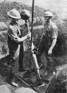 This was designed and manufactured by the Royal Ordnance Factories in early 1915 and introduced along with the 1.57-inch mortar in March 1915. It incorporated what was known of the German prewar Krupp mortar.[11] This was the first design to meet all the requirements, after modifications to simplify manufacture; it fired a good-sized spherical cast-iron bomb of 42 pounds (total projectile weight 51 pounds with stick and fuze), considered the largest practical size for use from trenches, at ranges from 100 to 600 yards using a simple 2-inch tube as the mortar body. The mortar and ammunition could be cheaply manufactured by small unsophisticated "trade" workshops; the bomb was safely detonated by a standard No. 80 "time and percussion" artillery fuze. Drawbacks were that the steel tail was usually projected backwards towards the firer when the bomb detonated, resulting in occasional casualties and the No. 80 fuze was also required by the 18-pounder field guns which were given priority, limiting mortar ammunition supply to the front until early 1916 when a special cheap trench mortar fuze was developed.[12]