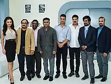 Shankar held initial discussions with Kamal Haasan, Aamir Khan, and then Vikram about portraying a further role, though none of the three actors signed on to appear in the film.[31][32] Subsequently, the team held talks with Hollywood actor Arnold Schwarzenegger for the role, who agreed to work on the film for a record remuneration.[33][34][35] The makers then opted against signing Schwarzenegger, though there have been conflicting reasons regarding this decision.[lower-alpha 3] British actress Amy Jackson signed on to work on the film in October 2015 and visited Los Angeles as a part of the team's pre-production work.[38] In late November 2015, Rajinikanth also travelled to Los Angeles to meet the film's producers and complete costume trials and initial motion capture effects work for the film.[39][40] After further negotiations with actors including Hrithik Roshan and Neil Nitin Mukesh, the makers signed on Akshay Kumar to portray the role for which Schwarzenegger was initially considered.[41]
