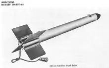 Designated 2.25-Inch Sub-Caliber Aircraft Rocket, the resulting rocket was a joint project between the Bureau of Ordnance and the National Defense Research Committee.[1] As its name implied, the rocket was designed as a sub-calibre weapon compared to the FFAR, being only 2.25 inches (57 mm) in diameter, but weighted to be ballistically similar to the larger operational weapons.[1] Varying the amount of propellant in the SCAR's motor could produce accurate simulations of either type of FFAR's flight characteristics.[1]