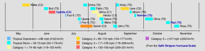 | Carlotta | June 18 – 25 | Category 4 hurricane | 155 (250) | 932 | Southwestern Mexico, Northwestern Mexico | Minimal | 18 | |||
