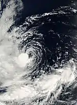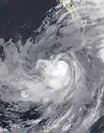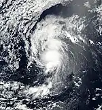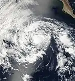 On July 11, a tropical wave moved off the African coast, and moved to the Lesser Antilles one week later. It passed over Central America near Panama on July 22 without any increase in organization. On July 25, the wave began to show curved banding, showing that it had become better organized. It intensified to a tropical depression on July 26 while located south southwest of Manzanillo, Mexico, designated as Tropical Depression Seven-E. The depression was upgraded to Tropical Storm Emilia later that day while moving northwest, steered by a mid-level ridge to its north.[19] During this time, Emilia was forecast to strengthen to a hurricane within two days, due to the system moving over warm waters.[20] However, late on July 27, the storm began to accelerate, meaning that it will move into cooler waters sooner than firstly anticipated, therefore, only allowing the storm to intensify within a few hours before weakening.[21] Emilia moved near Socorro Island and its intensity peaked with wind speeds of 65 mph (105 km/h), with an eyewall beginning to form. A few hours later, the storm moved into cooler waters and drier air, and Emilia's deep convection dissipated, weakening the storm.[19] Late on July 28 deep convection redeveloped near the storm's center, but wind shear prevented Emilia from strengthening.[22] It turned to the west and weakened below tropical storm intensity on July 29,[19] as the deep convection in the storm diminished again.[23] It shortly dissipated while located several hundred miles west south-west of Cabo San Lucas, Mexico.[19]