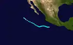 A tropical wave emerged from the African coast on the first day of August. The wave crossed Central America and southern Mexico into the Eastern Pacific, and on August 13, a 12:21 UTC QuikSCAT scan revealed a low-level circulation, and it was designated as a tropical depression. Early the next day, the depression strengthened into a 40 mph tropical storm named Ileana. Tropical Storm Ileana paralleled the Mexican coast and reached peak intensity as a high-end tropical storm early on August 15 with 70 mph winds. The storm maintained this intensity for 18 hours before passing just south of the Baja California Peninsula, turning west, and weakening to a tropical depression late on August 16. It dissipated early the next day, but the remnant low-level circulation persisted until August 20.[27]