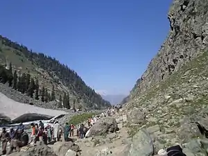 The 48-days July–August annual Hindu pilgrimage, undertaken by up to 600,000 or more pilgrims to 130 feet (40 m) high glacial Amarnath cave shrine of iced stalagmite Shiv linga e at 12,756 feet (3,888 m) in Himalayas, is called Amarnath Yatra.[5][6][7] It begins with a 43 kilometres (27 mi) mountainous trek from the Nunwan and Chandanwari base camps at Pahalgam and reaches cave-shine after night halts at Sheshnag Lake and Panchtarni camps.[8] The yatra is both a way of earning revenue by the state government by imposing tax on pilgrims,[9][10] and making living by the local Shia Muslim Bakarwal-Gujjars by taking a portion of revenue and by offering services to the Hindu pilgrims, and this source of income has been threatened by the militant groups who have banned and attacked the yatra numerous times,[11][12][13][14][15] as well as have massacred at least 30 and injured at least 60 people in Amarnath pilgrimage terrorist-attack massacre (2000) causing death of 21 unarmed Hindu pilgrims, 7 Muslim civilians and 3 security forces in a two hour long indiscriminate shoot out at Pahalgam town in Anantnag district.[2] See also: Amarnath pilgrimage terrorist-attack massacre (2000). This attack on Amarnath yatra was part of the larger 1st and 2nd August 2000 Kashmir massacre in 5 separate coordinated terrorist attacks that killed at least 89 (official count) to 105 people (as reported by PTI), and injured at least 62 more.[16]