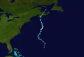 A weak low- to mid-level trough remained nearly stationary offshore the Southeastern United States in early September. A cut-off low developed over Florida on September 9, while an associated surface low formed by late on September 11. The system became a tropical depression around 18:00 UTC about 145 mi (235 km) west-southwest of Naples, Florida. The depression drifted west-southwest and slowly intensified, before doubling-back to the east-northeast and strengthening into Tropical Storm Gabrielle on September 13. Gabrielle curved northeastward and reached sustained winds of 70 mph (110 km/h) before making landfall near Venice, Florida, on the following day. After weakening slightly, Gabrielle emerged into the Atlantic near Titusville on September 15, accelerated to the northeast, and strengthened, becoming a Category 1 hurricane two days later. Colder water temperatures then weakened Gabrielle to a tropical storm on September 18, followed by an extratropical transition on September 19 well south of Newfoundland. The extratropical low was absorbed by a larger extratropical low over the far north Atlantic on September 21.[32]