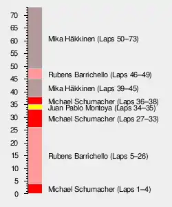 Once in the lead, Barrichello quickly opened up a considerable gap back to Schumacher, and by his first pit stop on Lap 27, he led by 12.5 seconds. He returned from the pits in fifth place, behind the two McLarens, as Schumacher returned to the lead. Montoya, meanwhile, was flying as his Michelin tires began to gain traction and provide him an advantage. On Lap 34, just a lap after nearly losing control in Turn 4, Montoya took the lead by outbraking Schumacher down the inside of Turn 1 as they approached the Minardi of Alex Yoong. "I was trying to get close enough coming into the straight," Montoya said later, "and that time I knew I was going to get close enough because of traffic. I just went for it." Michael Schumacher said later, "I don't know where he came from." Almost immediately, Montoya built a 2.3-second advantage, recording the fastest lap of the race before pitting on Lap 36 and returning in fifth. Once again, Schumacher led, this time from Häkkinen, with neither car having visited the pits.
