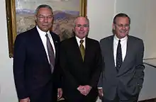 Australian Prime Minister John Howard (center) poses for a photograph with U.S. Secretary of Defense Donald Rumsfeld (right) and U.S. Secretary of State Colin Powell, inside the Australian Prime Minister's offices at the Parliament House, Canberra, Australia, on 30 July 2001. Two U.S. Secretaries are in Australia to attend Australia-U.S. Ministerial (AUSMIN) talks and conduct meetings with high-level government military and civilian officials.