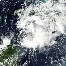 A tropical wave exited Africa on September 1, and after initial development became disorganized. It moved west-northwestward for a week, reorganizing enough by September 7 to be declared Tropical Depression Seven about 1155 mi (1855 km) east-southeast of Bermuda.[33] At the time, the depression had persistent convection around a small circulation, and it moved steadily westward due to a ridge to its north.[34] Shortly after forming, strong wind shear diminished the convection and left the center partially exposed.[35] By September 8, there was no remaining thunderstorm activity,[36] and the depression degenerated into a remnant low-pressure area.[37] The storm dissipated shortly after as strong wind shear continued to cause the storm to deteriorate while located 980 mi (1580 mi) southeast of Bermuda. The depression never affected land.[33]