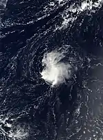 A tropical wave exited the African coast on August 27,[22] and with low favorable conditions the system organized into Tropical Depression Four on August 29 about 630 mi (1,020 km) southwest of Cape Verde.[23] Six hours later, the depression was upgraded to Tropical Storm Dolly after developing sufficient outflow and curved banding features.[24] The storm continued to intensify as more convection developed,[25] and Dolly reached peaked winds of 60 mph (95 km/h) on August 30.[22] After peaking in intensity, the storm suddenly lost organization,[26] and the winds decreased to minimal tropical storm force.[27] After a brief re-intensification trend, Dolly again weakened due to wind shear. On September 4, Dolly weakened to a tropical depression, and later that day was absorbed by the trough; it never affected land.[22]