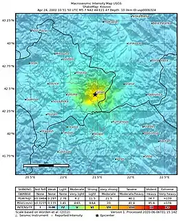The 2002 Gjilan earthquake was a 5.7 magnitude earthquake that occurred on April 24, 2002 at 12:51:50 p.m. CET. This earthquake had a Mercalli intensity of VII (Very Strong). It occurred at a depth of 10 km, causing very strong shaking across much of Gjilan, moderate shaking in some parts in Ferizaj, and light tremors across Kosovo, and some tremors across neighboring parts of Kosovo.[1]