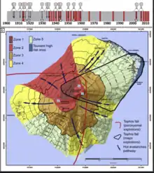 The north-west side is the result of the filling by the products of volcanic activity; a depression created as a result of multiple collapses of the same side occurred, according to recent studies at least in protohistoric times. The landslides that produced the tidal waves are the result of a sequence of deep movements (up to 70 m) that involved the North-East sector of the subaerial and submarine side of the Sciara after the beginning of the volcanic eruptions, which occurred on December 28. The complex evolution that led to the destructive landslides of December 30, 2002, was reconstructed when a group of researchers from the Sapienza University of Rome, the University of Bologna, the INGV-Section of Catania and the Institute of Environmental Geology and Geoengineering of the CNR undertook, on behalf of the Civil Protection Department, in the days after the landslide events, a special study aimed at assessing the evolution of the stability conditions in the following months, following the strong changes in morphological conditions produced by the intense erosive and effusive activity of Stromboli. A decisive contribution to the analysis of the phenomena came from the work carried out in the months before the events by the members of the research group. They were involved in two projects of the National Volcanology Group in which detailed surveys of the morphology of the emerged and submerged slopes and studies on the stability of the slopes were carried out. These surveys were compared with those carried out in the days following the landslides of December 30 and integrated with the analysis of aerial photos following the landslide and with helicopter photos acquired during the sequence of the various phenomena of instability that followed the eruption. These data were used for the analysis of backward stability of the slope that gave the first clues about the triggering mechanisms. Thus, it was possible to reconstruct the dynamics of the events. This reconstruction highlighted the fundamental role of the magma intrusion on the slope during the types of volcanic eruptions, which triggered the first deep movements of the north-east sector of the Sciara slope at least one day before the destructive landslide events, and of the instability of the submarine portion of the slope, from which the subsequent landslides propagated upstream.[3][7]