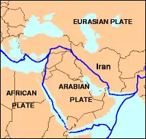 Iran suffers from frequent earthquakes, with minor quakes occurring almost daily.[8] This earthquake occurred as a result of stresses generated by movement of one tectonic plate, the Arabian plate, moving northward against another, the Eurasian plate, at approximately 3 centimetres (1 in) per year. The Earth's crust deforms in response to the plate motion in a broad zone spanning the width of Iran and extending north into Turkmenistan. Earthquakes occur as the result of reverse faulting and strike-slip faulting in the zone of deformation.[11]