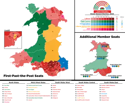 The 2003 National Assembly for Wales election was the second general election to the National Assembly for Wales. It was held on 1 May 2003. The election was characterised by a resurgence for the Labour Party, whilst Plaid Cymru saw a reduction in support and the number of Assembly Members they returned. Having won thirty seats, one short of a majority, Labour chose to govern in minority without a coalition partner.[1]