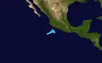 A tropical wave passed over Central America on July 12 and began to show signs of organization south of the Gulf of Tehuantepec two days later, prompting Dvorak classifications on the system. As it continued to develop, the NHC designated the system a tropical depression at 18:00 UTC on July 17 about 360 mi (580 km) south of Manzanillo.[20] Tracking westward on the southern periphery of a ridge, the depression became Tropical Storm Felicia twelve hours later, and forecasters anticipated further strengthening into a minimal hurricane.[22] However, the storm remained disorganized and peaked with 50 mph (85 km/h) winds late on July 18. The storm gradually weakened under increasing shear as it headed west, weakening back to a tropical depression on July 20 and degenerating to a remnant low around 12:00 UTC on July 23. After a west-northwestward turn, the remnant low entered the Central Pacific, where it dissipated well east of Hawaii on July 24. Felicia did not impact land.[23]