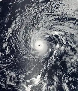 At 06:00 UTC on August 28, an area of disturbed weather within the Intertropical Convergence Zone developed into Tropical Depression Ten-E some 1,725 miles (2,775 km) east of the Hawaiian Islands. The storm began to steadily intensify as it tracked over warm ocean waters, attaining tropical storm status six hours later. Shortly after developing an eye, Jimena was upgraded into a hurricane on August 29. The storm moved to the west, entering the Central Pacific as it continued to strengthen. After reaching its peak strength with 105 mph (169 km/h) winds about 800 mi (1,300 km) to the east of Hawaii, Jimena began to weaken as a result of increased shear. The storm passed about 120 mi (195 km) to the south of the southern tip of Big Island on September 1 as it fell below hurricane strength. Further weakening brought the cyclone back to tropical depression intensity on September 3. It crossed the International Date Line before dissipating on September 5.[38]
