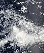 A tropical wave entered the eastern north Pacific Ocean on August 1 and began to show signs of organization three days later, including the development of convection and the formation of a surface low. It acquired sufficient organization to be deemed a tropical depression by 06:00 UTC on August 7 roughly 605 mi (975 km) southwest of Cabo San Lucas.[24] Although the system was forecast to remain under tropical storm intensity and ultimately dissipate,[25] it became more organized as it moved to the west. At 00:00 UTC on August 8, the depression was upgraded to Tropical Storm Guillermo. Later that day, Guillermo reached its peak strength with 60 mph (95 km/h) winds. It maintained this strength for a full day, until outflow from the developing Tropical Storm Hilda about 690 mi (1,110 km) to its east disrupted its convection. Guillermo weakened into a tropical depression on August 11, and it became further disheveled as wind shear increased from the west. Associated deep convection collapsed on August 12, and Guillermo degenerated to a remnant low around 18:00 UTC. The remnant low entered the Central Pacific and interacted with another weak low-level circulation that would later become Tropical Depression One-C prior to dissipation on August 13.[24][26]