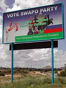 General elections were held in Namibia on 15 and 16 November 2004 to elect the President and National Assembly. The National Assembly election resulted in a landslide win for SWAPO, which won 55 of the 78 seats with over 75% of the vote. SWAPO's candidate for president, Hifikepunye Pohamba, won the presidential election. Following his victory, Pohamba was sworn in as President on 21 March 2005 at Independence Stadium in Windhoek.[1]