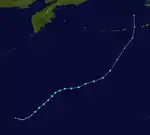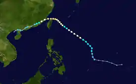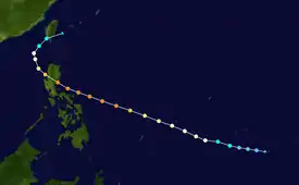 The near-equatorial trough spawned a tropical disturbance east of the Philippines late on March 13. It rapidly moved northwest as it became a tropical depression in the afternoon hours of the next day. Due to warm waters and moderate convection, it rapidly intensified, with a brief turn to the southwest. On March 17, it reached peak intensity as a tropical storm, with the PAGASA naming it as Butchoy. The system rapidly weakened on March 19, just before the storm was about to hit the Philippines. A weak trough brought it northward, where dry air and vertical shear caused it to dissipate on March 23.[6]