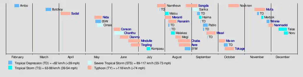 Activity of the season was extremely high, the impacts of the typhoons were damaging and deadly, including four consecutive typhoons that struck them in the Philippines. In August, Typhoon Rananim struck Taiwan and China causing widespread damage, killing 169 people and with an estimated $2.44 billion (USD 2004) in damage. Typhoon Aere also caused heavy damage in China after Rananim killing 107 people there with minimal damage. Typhoon Songda was the costliest typhoon of the season to hit Japan, with damage estimated at $9.3 billion (USD 2004)[nb 2] and 28 people killed. In October, Typhoon Tokage hit Japan as a tropical storm, causing a total of 95 deaths and damage estimated at $2.3 billion (2004 USD). Tropical Depression Winnie struck the Philippines killing a total of 1,593 people, making Winnie the deadliest storm of the season since Tropical Storm Thelma in 1991. The seasonal activity from November onwards is decreasing, including two typhoons, Muifa strikes the Philippines after Winnie, killing 68 people and subsequently bringing heavy rains to Thailand killing 40 people. The fourth and last consecutive typhoon to hit the Philippines was Nanmadol which made landfall as an Category 4 typhoon in that country, killing a total of 77 people. The Accumulated Cyclone Energy (ACE) index of this season amounted to 60% above the normal level for Pacific typhoon seasons, at 480.6. This makes as the third-most active season in recorded history, only after 1997 and 1992.[4]
