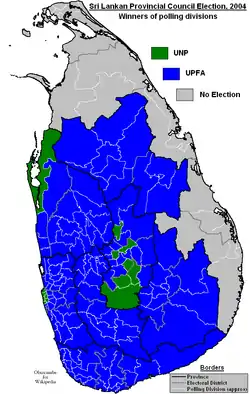 ![]() Winners of polling divisions. UPFA in blue and UNP in green. | ||||||||||||||||||||||