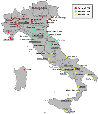 As usual, Serie C2 was composed by three divisions, whose teams were divided geographically. Division C2/A was mainly composed by Northern Italy and Sardinian teams, whereas division C2/B included North-Central and Central Italy teams, with the exception of two teams from Campania (Benevento and Cavese), and division C2/C was represented by teams hailing from Central-Southern Italy and Sicily.