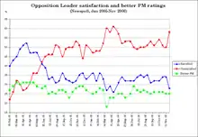 Shortly after his election, Beazley's opinion poll ratings fell to a level between 30 and 35% and never recovered. By November 2006, media sources were claimed that consistently bad polls demonstrated that Beazley did not have the "ability to cut through", and The Australian's editorial complained on 22 November that "after 10 years and 10 months of Kim Beazley, it is still virtually impossible to say what he stands for".[2][3] In addition, a series of embarrassing media gaffes, including referring to TV presenter Rove McManus as Karl Rove when extending condolences to McManus over his wife's death, raised questions about his ability and capacity to lead.[4]