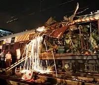 ![]() One of the bomb-damaged coaches at the Mahim station | |