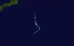 Maria formed out of a tropical depression over the open waters of the western Pacific Ocean. On August 5, the JMA classified the depression as a tropical storm while the JTWC kept it as a depression.[29][30] The storm quickly strengthened into a typhoon the next day, reaching its peak intensity with winds of 130 km/h (80 mph) early on August 6. The storm gradually weakened as it began to recurve, causing it to parallel the southeastern coast of Japan. On August 9, Maria weakened into a tropical depression and later into an extratropical cyclone before dissipating on August 15.[29] Maria had only minor effects in Japan, mainly heavy rains which were estimated to have peaked over 400 mm (15.7 in) on the Izu Peninsula.[31] One person was killed after being struck by lightning and six others were injured.[32][33][34]