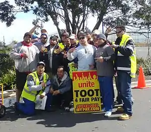 At a special affiliates meeting of the New Zealand Council of Trade Unions, the organisation representing 350,000 New Zealand union members, a resolution was passed condemning the lock out and supporting the claims of distribution workers, resolving "That each union, separately and collectively, will continue to take every possible action to support the NDU, the EPMU and their distribution worker members to achieve a fair settlement of their dispute".[18] The Maritime Union of New Zealand issued a statement pledging "financial, practical and moral support for the workers and their pickets"[19] and threatened to stop unloading supermarket goods at the wharves.[20] They also worked to gain international support for the locked out workers, including from the International Transport Workers Federation, which represents 4,500,000 transport workers in 142 countries. Maritime union members voted to each contribute one hour of pay to the locked out worker fund each week until the dispute was settled.[21] Over $425,000[22] was raised by the unions to support the locked out workers, a big part of this was $30,000 a week from one Auckland workplace with 1500 unionised staff[23] and large donations from Australian unions the Maritime Union of Australia, the Transport Workers' Union and the Rail Tram and Bus Union. On 18 September representatives of these unions travelled to New Zealand to join the picket likes.[24]