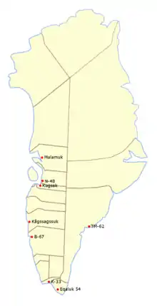Location of teams participating in the 2007 Greenlandic Men's Football Championship.