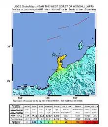 The Japan Meteorological Agency placed the earthquake at 37.3°N, 136.5°E, at a depth of 11 km. It estimated the magnitude at 7.1, but later revised its estimate to 6.9. The earthquake had a maximum three-component vector sum peak ground acceleration of 1,304 cm/s2 (1.33 g).[8] It occurred in a big seismic gap. Shaking in Wajima was very close to Shindo 7. It was the first time that Shindo 6- or more was observed in Ishikawa prefecture. It was also the 2nd time that Shindo 5- or more was observed in Toyama prefecture.