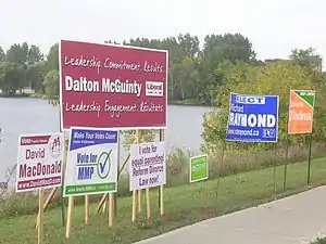The 2007 Ontario general election was held on October 10, 2007, to elect members (MPPs) of the 39th Legislative Assembly of the Province of Ontario, Canada. The Liberals under Premier Dalton McGuinty won the election with a majority government, winning 71 out of a possible 107 seats with 42.2% of the popular vote. The election set a record for the lowest voter turnout in an Ontario provincial election; only 52.8% people who were eligible voted. This broke the previous record of 54.7% in the 1923 election.[1]